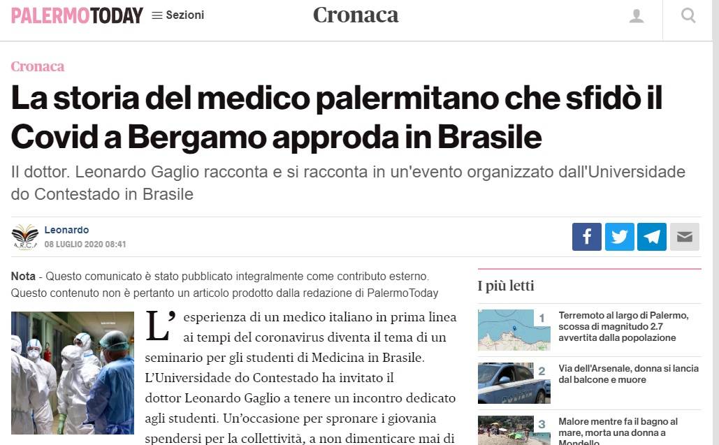 A Webinar “Missão e Coragem: relatos de um médico italiano no combate a COVID-19” promovida pela Universidade do Contestado é notícia no Jornal italiano Palermo Today desta quarta-feira, 08.
