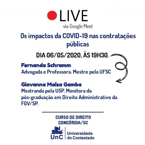 A live será realizada no dia 06 de maio, quarta-feira, às 19h30, via Google Meet sobre o tema: Os impactos da COVID-19 nas contratações públicas, com Fernanda Schramm, advogada, professora e mestre pela UFSC e Giovanna Maísa Gamba, mestranda pela USP, monitora da pós-graduação em Direito Administrativo da FGV/SP.